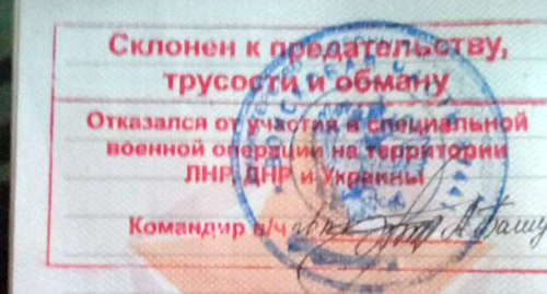Аналогичный случай с такой же печатью ранее произошел в Дагестане. Гребенюк рассказал, что руководство отделения кадров 136-й отдельной гвардейской мотострелковой бригады с дислокацией в Дагестане поставило штамп в учетно-послужную карту контрактника, который был уволен из-за отказа отправиться на Украину. Контрактник, по словам правозащитника, пробыл в командировке в Сирии семь месяцев, и ему был положен реабилитационный отпуск, однако командование предложило ему участвовать в спецоперации. Гребенюк считает, что такие записи появляются в документах военнослужащих, "чтобы оскорбить, унизить военнослужащего, сделать так, чтобы другим было неповадно".