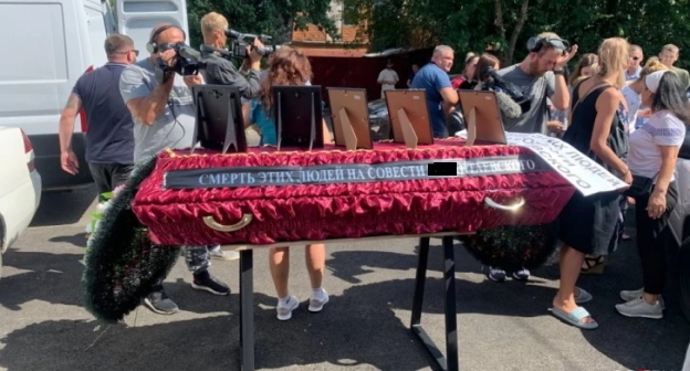 Жители Краснодара собрались с плакатами перед домом местного бизнесмена. Они принесли к особняку гроб, на который установили фотографии людей, которые, как они заявили, не пережили мошенничество.