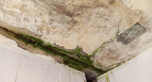 Корреспондент "Кавказского узла" также осмотрел дом изнутри. На лестничной клетке краска на стенах облупилась, с потолков свисает электропроводка. Коридоры темные из-за отсутствия освещения, на потолках видны разводы от подтеков. При этом следы от влаги расположены у электропроводки и ламп.