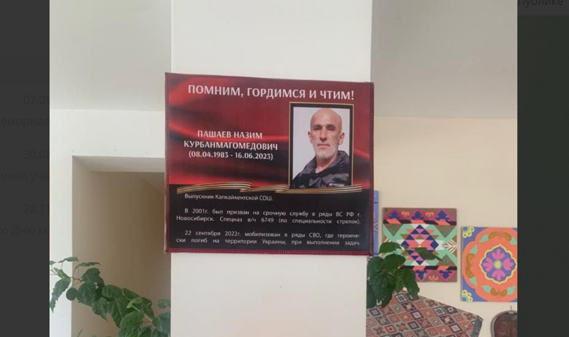 Назим Пашаев погиб в зоне военной операции на Украине, сообщила сегодня администрация Каякентского района в своем Telegram-канале, отчитываясь об открытии уголка памяти в школе, где он учился. Как следует из приложенных к сообщению фотографий с плаката в память о Пашаеве, ему было 40 лет, он был мобилизован осенью 2022 года, погиб 16 июня.