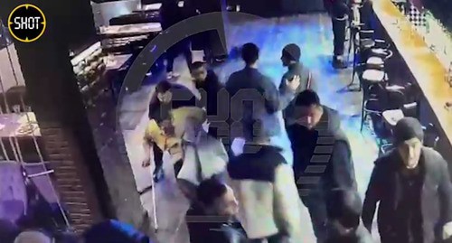 К сообщению приложена видеозапись из бара, на которой в драке участвуют не менее пяти человек, в том числе бьют лежащего на полу. Еще несколько человек пытаются разнять их.
