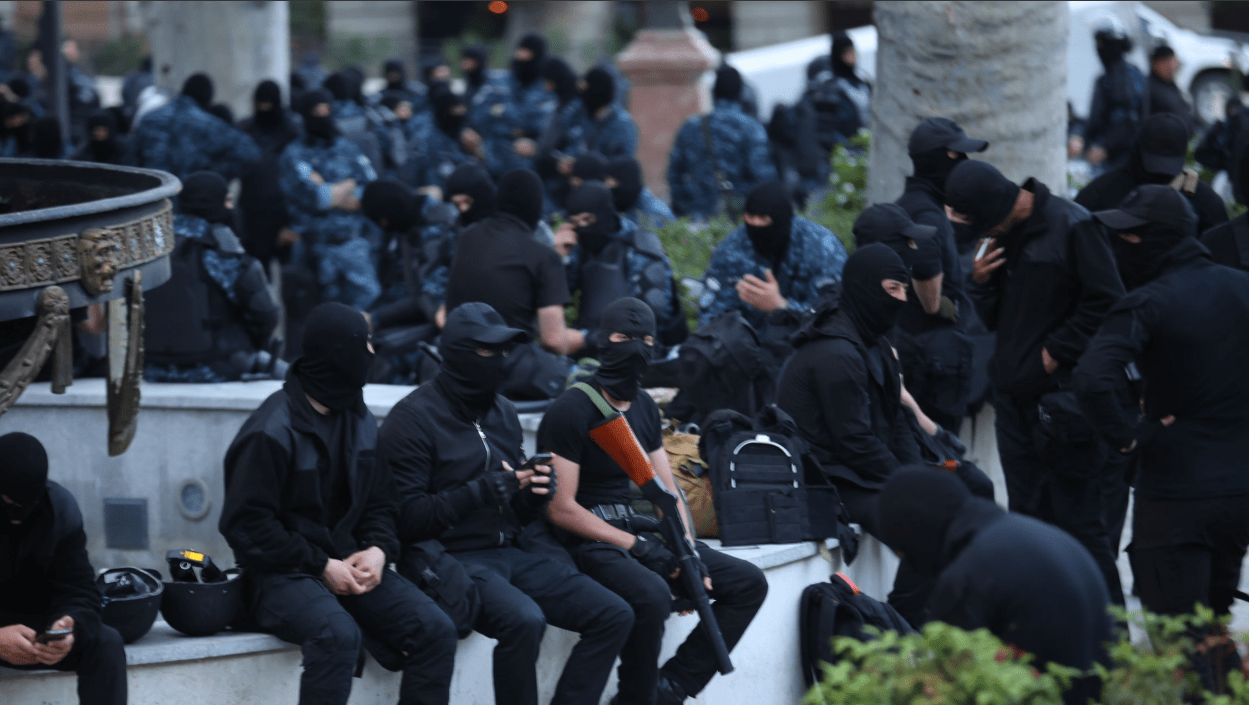 Телеканал "Пирвели" сообщил сегодня о массовой мобилизации полиции и спецназа в Тбилиси. Часть автобусов со спецназом уже находится во дворе парламента Грузии. Также телекомпания опубликовала видео, как спецназовцы отдыхают на газонах.