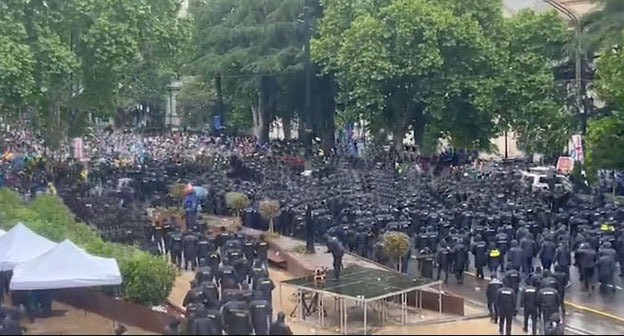 Агентство "Новости Грузия" в своем telegram-канале опубликовало видео, как сотни силовиков оттеснили протестующих с площади у парламента.