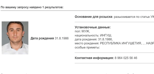 В базе розыска МВД России указан Аушев Усман Баширович с датой рождения 31.08.1996. В карточке из базы розыска, поступившей по запросу "Кавказского узла" не указано, по какой статье он объявлен в розыск.