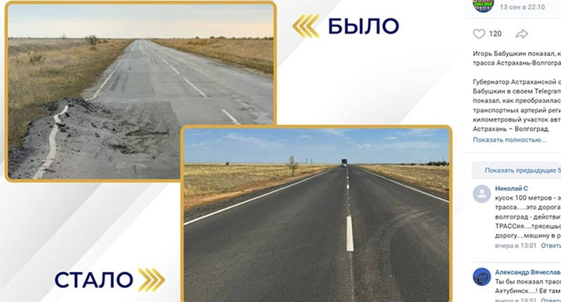 Астраханцы неоднократно жаловались властям на плохое состояние одного из участков трассы Астрахань – Волгоград, и его удалось отремонтировать в рамках нацпроекта "Безопасные качественные дороги". Дополнительно из регионального бюджета на ремонт направили более 580 миллионов рублей, рапортовал 13 сентября на своей странице в соцсети "ВКонтакте" губернатор Астраханской области Игорь Бабушкин.