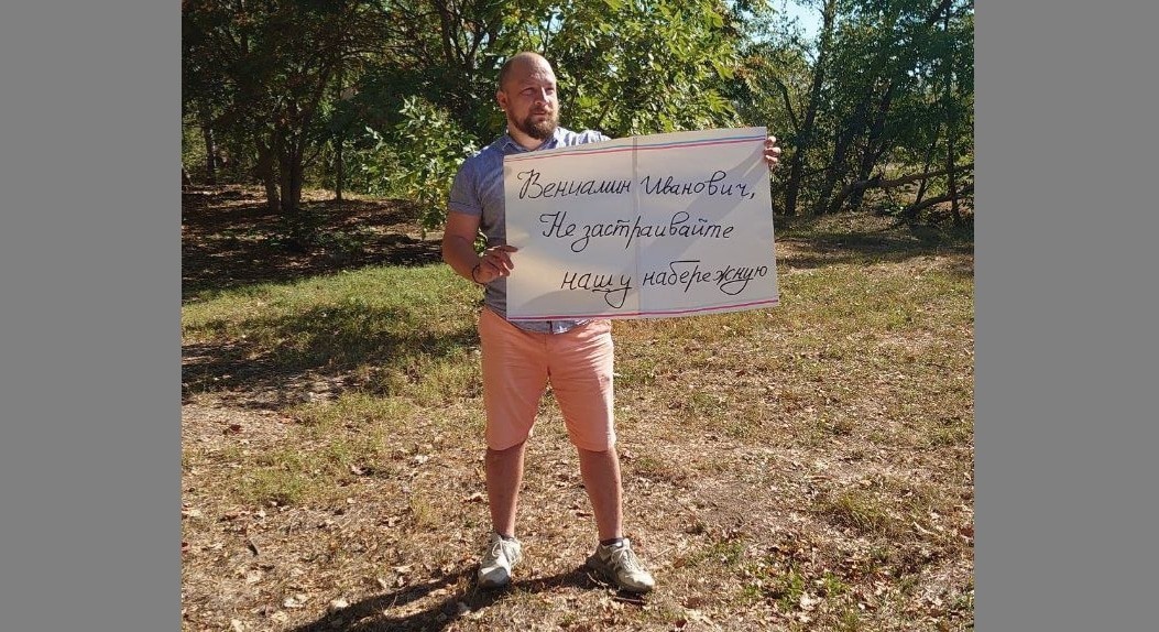 Публикация проиллюстрирована двумя фотографиями, на которых мужчина держит в руках плакат с надписью: "Вениамин Иванович, не застраивайте нашу набережную". Других людей в кадре не видно.