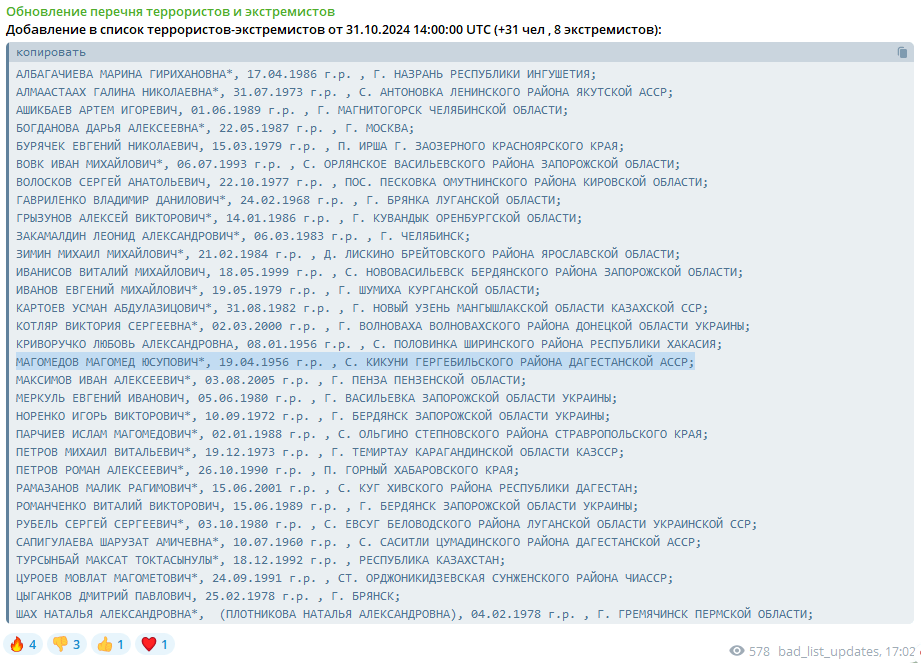 Данные 68-летнего Магомеда Магомедова, уроженца селения Кикуни Гергебильского района Дагестана, внесли в реестр террористов и экстремистов Росфинмониторинга 31 октября, следует из сообщения телеграм-бота, отслеживающего обновления списка.