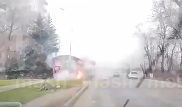 Публикация проиллюстрирована видеозаписью, сделанной из салона движущегося автомобиля. На записи слышны звуки серии взрывов и видны вспышки и дым, а также разлетающиеся в разные стороны от павильона фейерверки.