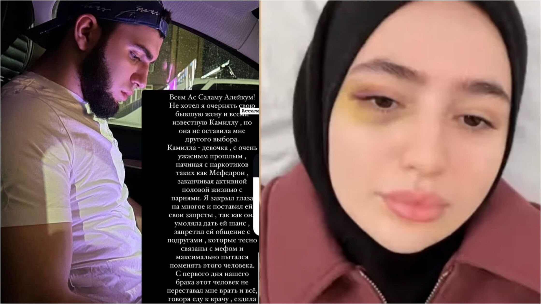 Сториз из соцсетей Камиллы. Скриншот https://t.me/nn_com/3510**В результате он жестоко избил Камиллу, а затем заставил ее извиняться на камеру, сняв на видео в нижнем белье. Скриншоты с угрозами, записи разговоров Камилла опубликовала в своем блоге с более чем 250 тысяч подписчиков. Она опубликовала видео, на котором кадры свадьбы сменялись фото с гематомами на лице. Девушка обратилась в полицию и больницу. Медицинские эксперты зафиксировали у нее сотрясение мозга, ушибы на бедрах и гематомы. Камилла высказала опасения за свою жизнь и призвала жительниц Дагестана быть осторожными и не замалчивать случаи домашнего насилия 4.