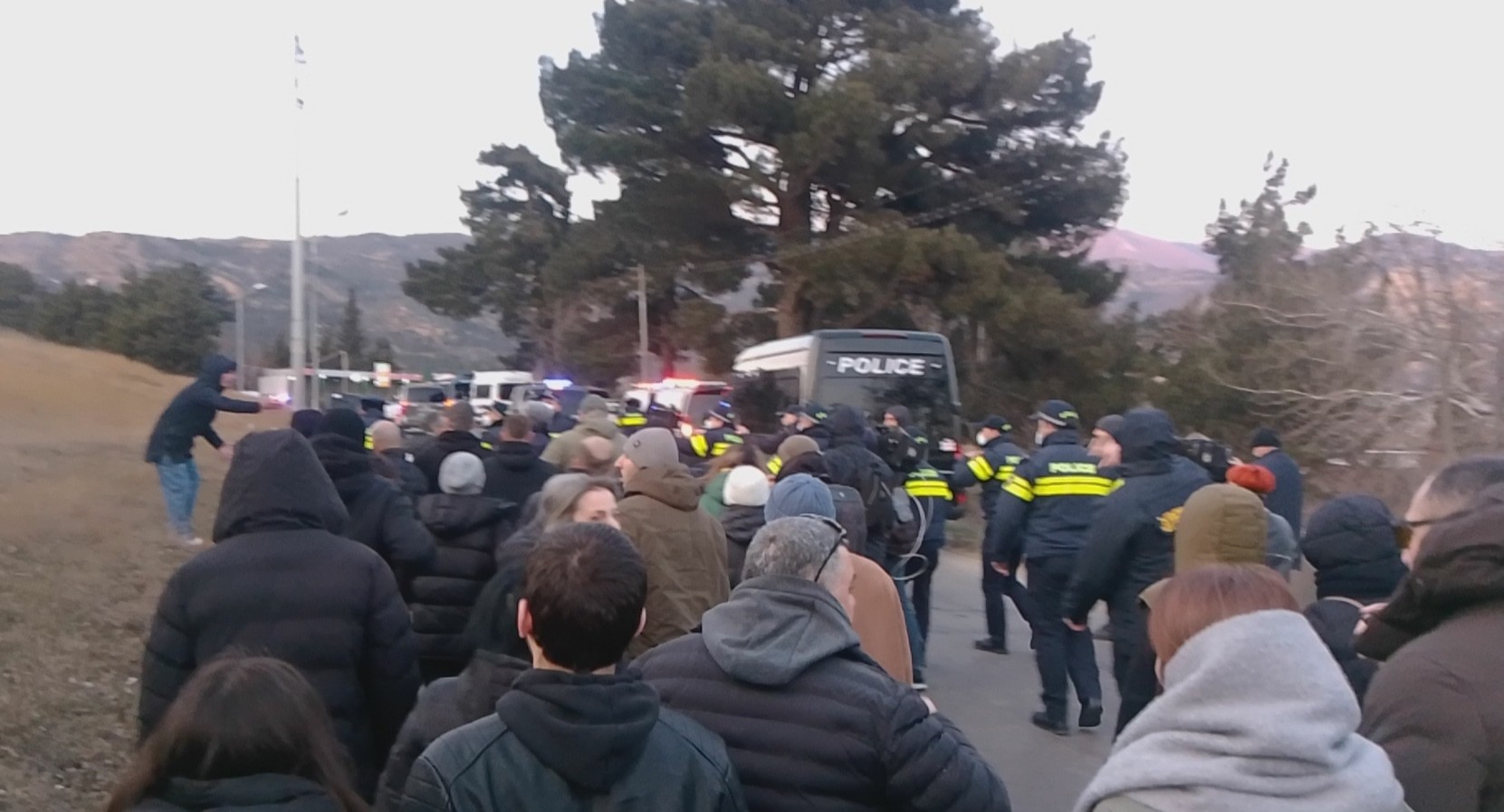 Полицейские начали задерживать протестующих во время их шествия вдоль аллеи Агмашенебели. Так, одного из участников акции силовики схватили и поволокли вдоль трассы к автомобилю патрульной службы. Несмотря на попытки протестующих освободить этого человека, его посадили в служебный автомобиль и увезли.
