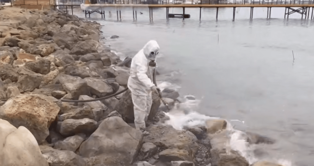 На приложенном к публикации видео спасатели в защитных костюмах обрабатывают крупные загрязненные камни на побережье.