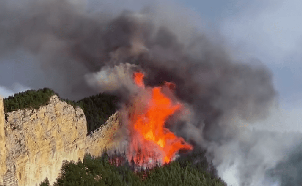 На другом видео, чуть ранее опубликованном в паблике села, видно, как на вершине горы пылает лес.