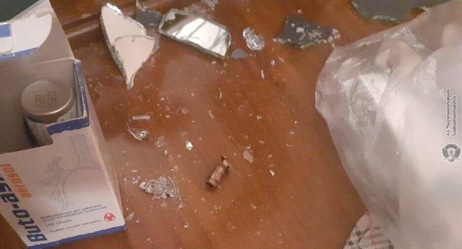Сообщение сопровождается фотографиями повреждений в жилом доме. На снимках видны отверстие в оконном стекле, разбитое зеркало, осколки стекла, обломки мебели и штукатурки, а также деформированная пуля.