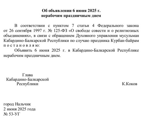 Указ Кокова, размещенный на его сайте, датирован 2 июня. "В связи с обращением Духовного управления мусульман Кабардино-Балкарской Республики по случаю праздника Курбан-байрам постановляю: объявить 6 июня 2025 г. в Кабардино-Балкарской Республике нерабочим праздничным днем", - говорится в документе.