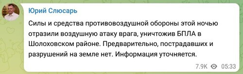 Минувшей ночью силы противовоздушной обороны уничтожили беспилотник в Шолоховском районе, сообщил в своем телеграм-канале врио губернатора Юрий Слюсарь.