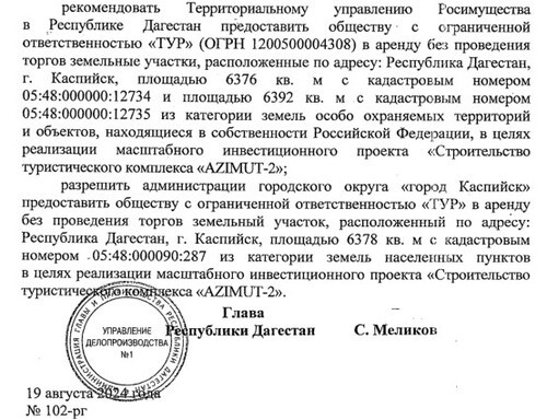 В документе содержится распоряжение "рекомендовать Территориальному управлению Росимущества в Республике Дагестан" предоставить ООО "ТУР" в аренду без проведения торгов земельные участки в Каспийске площадью 6376 квадратных метров и 6392 квадратных метров из категории земель особо охраняемых территорий и объектов, находящиеся в собственности России, "в целях реализации масштабного инвестиционного проекта "Строительство туристического комплекса AZIMUT-2".