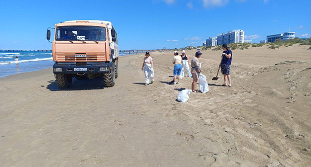 По данным оперштаба, представители муниципалитетов Краснодарского края, привлеченные к уборке анапских пляжей, продолжаются заниматься очисткой песка. В частности, одна из команд проводит деликатную очистку песка на Центральном пляже, другая – на береговой полосе в Витязево.