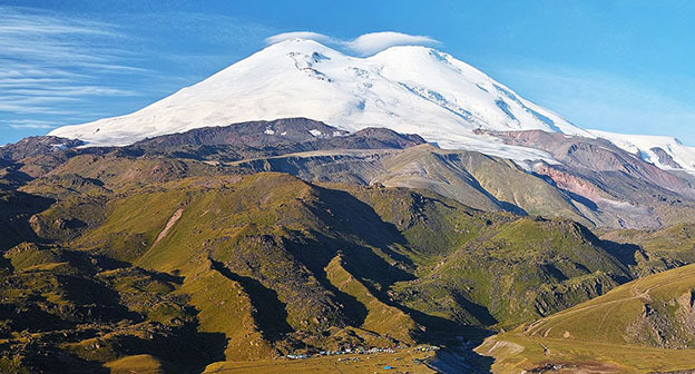 Эльбрус — это двухвершинный конус потухшего вулкана, высота обеих вершин превышает 5,6 километра. Эльбрус привлекает альпинистов и горнолыжников всего мира, указано в справке "Кавказского узла" "Эльбрус — патриарх Кавказских гор".