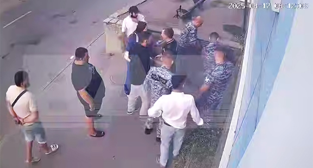 Видео, в частности, опубликовано телеграм-каналом Baza, который уточняет, что инцидент произошел 17 августа. На ролике зафиксировано, как человек в форме Росгвардии распыляет газ из баллончика в лицо спорившего с ним мужчины, а затем избивает его кулаками и ногами. Позднее к избиению присоединяются еще два силовика, один из которых держит мужчину, а двое других пинают его. В итоге избиваемый с заведенными за спину руками лежит на земле, а один из силовиков наносит удары дубинкой.