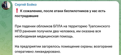 "При падении обломков БПЛА на территорию Туапсинского НПЗ ранения получили два человека, им оказана вся необходимая медицинская помощь. На предприятии загорелось помещение охраны, возгорание оперативно ликвидировано", - написал он.