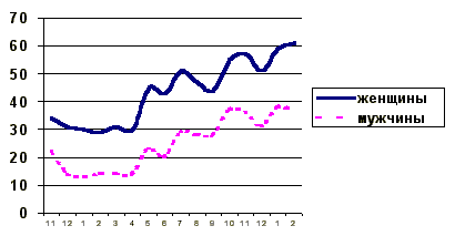 Разница между мужчинами и женщинами в подходах к военным действиям в Чечне существовала с самого начала. Более того, в первые месяцы 2000 года она была больше. Доля выступавших за переговоры среди женщин была 28-30%, а среди мужчин - около 12%, то есть в два с лишним раза меньше. (Разрыв лишь однажды сокращался до полуторакратного в октябре 2000-го.)