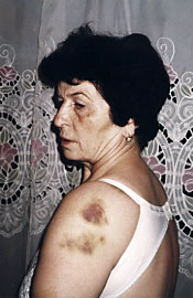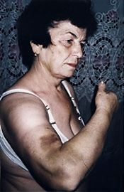 На фотографиях № 1, 2, 3 жительница г.Шеки Пашаева Кулхар Шабан гызы, 1934 года рождения. На этих фото, сделанных 20 ноября 2000 года отчетливо видны следы жестоких избиений на теле 66-летней женщины. К.Пашаеву избивали и пытали в Городском Управлении полиции города Шеки. Начальник ГУП г.Шеки полковник Гамлет Садыхов в 2002 году получил повышение по службе.