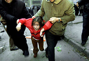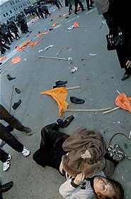 После тотальный фальсификаций выборов в парламент 6 ноября 2005 г., избиратели, чьи голоса были в очередной раз украдены, вышли на улицы столицы и провинциальных городов, требуя отмены результатов фальсификаций. 26 ноября 2005 года в г.Баку полиция атаковала мирных демонстрантов за 10 минут до истечения срока митинга, официально разрешенного городской властью. Мирные демонстранты и ряд лидеров оппозиции заявили о своем желании продолжить митинг и сели на землю. Полиция без предупреждения, не дав никакой возможности женщинам и детям покинуть площадь, на которой собралось несколько десятков тысяч человек атаковала людей, пришедших на разрешенный митинг. Против мирных безоружных студентов, стариков, женщин и детей были задействованы силы полиции, внутренних войск и специальные нелегальные отряды погромщиков. Людей били дубинками, валили на землю и добивали, травили газом, собаками и поливали из водометов. На фото №№ 6, 7, 8, 9, 10, 11, - женщины и девочки, избитые представителями правоохранительных органов Азербайджана.