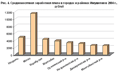 Как и в других регионах, в Ингушетии велики отраслевые различия в заработной плате: в сельском, лесном хозяйстве, культуре она составляла в 2004 г. 1,8—2,3 тыс. руб., в аппарате органов управления – 7,3 тыс. руб. (в 3,5 раза выше), а в кредитно-финансовых и общественных организациях – более 10 тыс. руб. в месяц (в 5 раз выше). По уровню заработной платы особенно выделяется чиновничий Магас, где официальные заработки в 4 раза выше, чем в сельской местности республики (рис. 4).