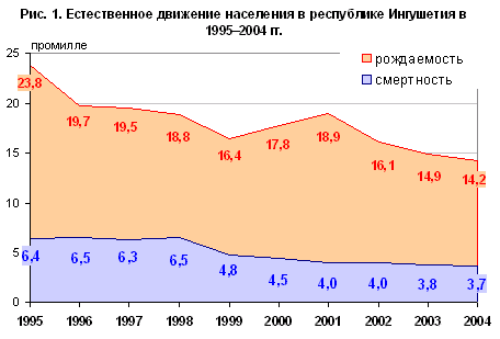 Статистика позволяет проследить демографические изменения только за последние 10 лет, но следует отметить, что точность всех демографических показателей в Ингушетии относительна. Так, за последние 10 лет численность населения республики увеличилась на 72%, тогда как учитываемый миграционный и естественный прирост составил только 40%. Разница почти в 90 тыс. человек (табл. 1) – недоучтенная миграция беженцев, а также, по мнению ряда экспертов, приписка около 40 тыс. человек во время Всероссийской переписи населения 2002 г.