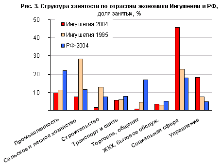За последнее десятилетие ситуация на легальном рынке труда республики резко ухудшилась: в 1995 г. в экономике было занято 48,8 тыс. человек, или почти 40% от числа трудоспособных граждан Ингушетии, в том числе в материальном производстве – 28 тыс. человек (57%), против 8 тыс. человек в 2004 г., в социальной сфере работало 23%, а в госуправлении – 7,5%. Изменения занятости свидетельствуют о нарастающем кризисе: при общем сокращении официальной занятости за период 1995—2004 гг. на 50%, численность занятых в сельском хозяйстве уменьшилась в 5,5 раз, в промышленности – в 2 раза, тогда как в госуправлении выросла в 5 раз. Одна из причин — изменение системы учета занятости в управлении, куда теперь частично включены охранные структуры. В Ингушетии же работа в силовых структурах (милиция, охранные ведомства) относится к наиболее распространенным видам занятости, по оценочным данным, только в милиции занято около 6 тыс. человек, и эта работа позволяет получать немалые теневые доходы.