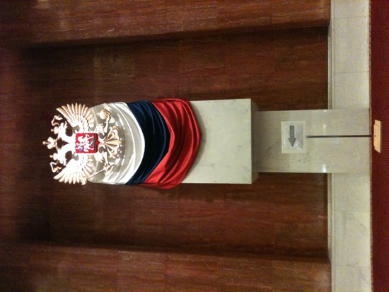 Интерьер соответсвует внешему виду, а гобеллены изображающие 15 юношей и девушек, которые отождествляют собой братские советские республики все также служат утеплителем стен. А за металлическим гербом, обёрнутым в российский флаг, скрывается огромный бюст ВИЛена.