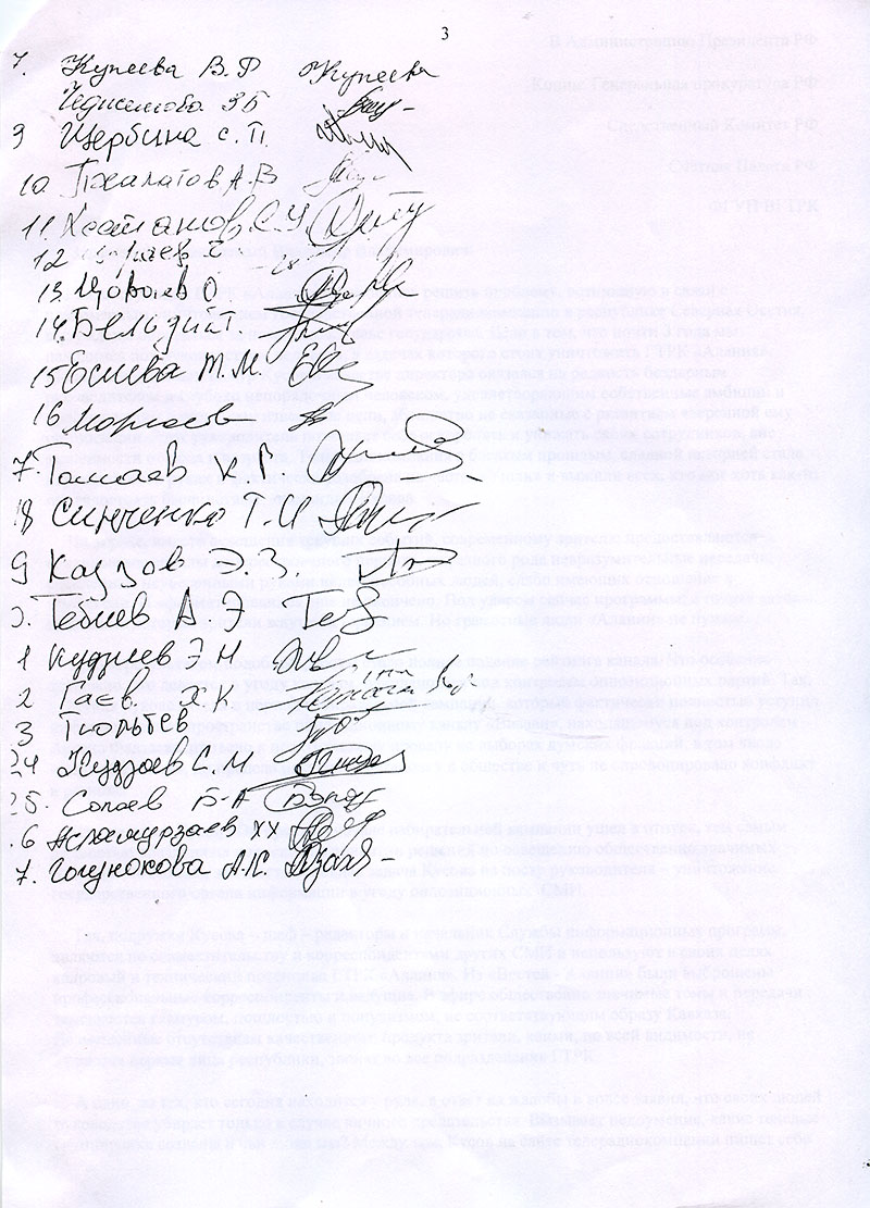 как оказалось, коллектив местного ГТРК требует уволить руководителя Тимура Кусова. в связи с чем, по сложившейся в обществе традиции обращается сразу к ВВП. за что и про что, читайте сами. опять же, я давно не бываю на ТВ, с тех пор как передача моя не выходит, года два, если не ошибаюсь, и не в курсе внутренних проблем. но читая это обращение, мне очень не понравилось то, что коллектив подписавшихся журналистов запугивает всех засилием "оппозиционных СМИ", которых, если уж говорить, в республике не существует. хотя, что тут говорить, сотрудники госоргана СМИ, все ясно и понятно. но все равно неприятно.