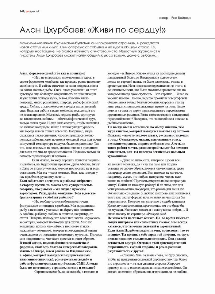 Даже не знаю, есть наверно. Время все же меняет человека, да и ты сам рано или поздно устаешь от своего образа, хочется что-то менять, даже наперекор своим желаниям. Вам никогда не хотелось, например, съесть что-нибудь невкусное, что вы всю жизнь не любили? Прочесть смертельно неинтересную книгу? Пойти на тяжелую работу? Я не знаю что для меня работа мечты, я знаю что работа для меня это обязательно созидание. Я люблю смотреть как появляется текст, люблю смотреть как растет форель, но я не знаю на чем я хочу остановиться. Конечно же, я мечтаю о судьбе Капитана Кусто, ну или совершить кругосветку, вот это было бы по-мужски. Кто знает, может я смогу когда-нибудь… И снова попаду на страницы журнала «Проспект»!