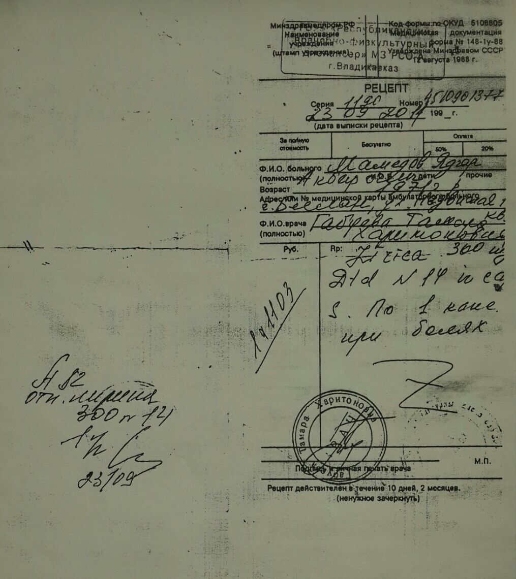 27 сентября 2014 года я поехал в Тбилиси из Владикавказа, чтобы купить запчасть на свой автомобиль. При пересечении границы, сотрудниками таможни и органами полиции Грузии, моя машина была досмотрена. Обнаружив в автомобиле вышеуказанный препарат в количестве всего трёх таблеток, меня задержали и заключили под стражу на 72 часа. На предоставленный мною рецепт при задержании мне сказали, что нужно сделать экспертизу на подтверждение то ли это лекарство. В дальнейшем представленные следствию выписку из медицинской карты и ответ Минздрава РФ на адвокатский запрос, грузинские правоохранители проигнорировали. Через трое суток меня выпустили под залог в размере 1000 лари (20 000 рублей), предъявив обвинение в незаконном приобретении и хранении психотропных средств. Судебное заседание назначено в городе Мцхета в Грузии на 18 ноября 2014 года. Автомобиль изъяли при задержании на таможне и отправили на штрафстоянку в Тбилиси, и мне наложили запрет на выезд из Грузии, мотивируя это тем что я нахожусь под следствием.