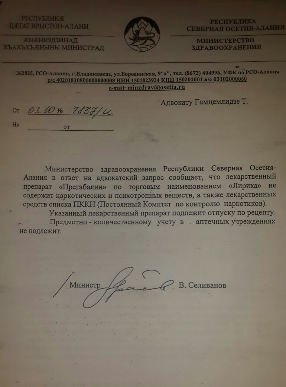 Я, Мамедов Ядгар Акбар оглы, гражданин Российской Федерации, проживающий в городе Беслан Республики Северная Осетия, страдаю люмбоишалгией и артритом коленных суставов. Врачом Республиканского врачебно-физкультурного диспансера города Владикавказа для купирования нейролептических болей мне был назначен препарат Прегабалин под торговым названием Lirika 300 mg N14 in capc и выписан рецепт на рецептурном бланке.