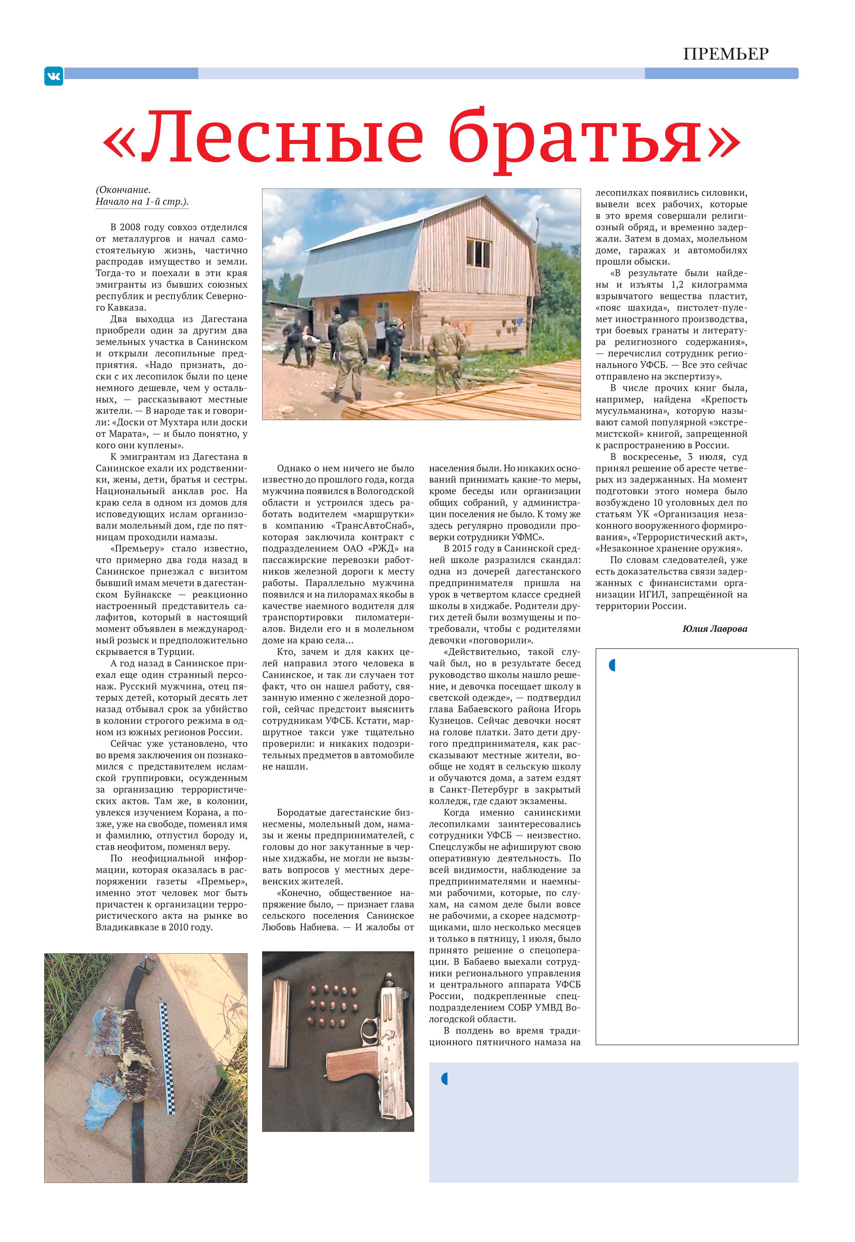 неделю назад, в деревне Санинское Вологодской области, спецслужбы задержали больше десяти мусульман, занимавшихся там заготовкой леса. были изъяты оружие, взрывчатка и зпрещенная литература. позже четверых из них арестовали, возбудив десять уголовных дел, в том числе по факту террористической деятельности.