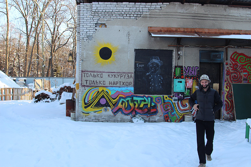 граффити-портрет Сослана Моуравова на входе в "Портал". Моуравов - резчик по дереву, который посвятил себя возрождению старинных музыкальных инструментов. можно сказать, культовая фигура для "порталовцев". в этом помещении была его мастерская.
