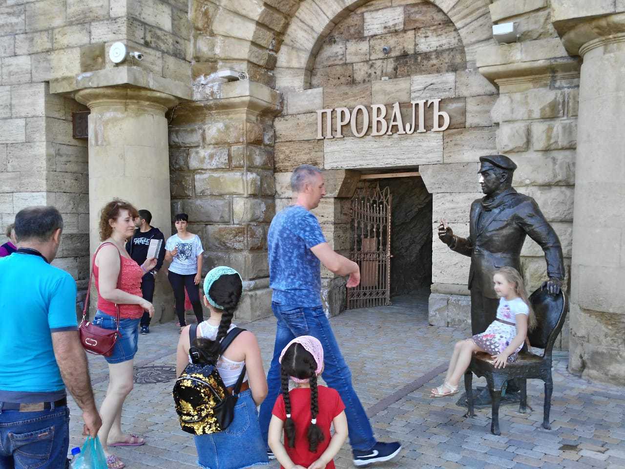 вообще, в Пятигорске умело используют любые упоминания о городе в литературе. вот Бендер, которые собирает плату за билеты в Провал (в действительности вход по-прежнему бесплатный)