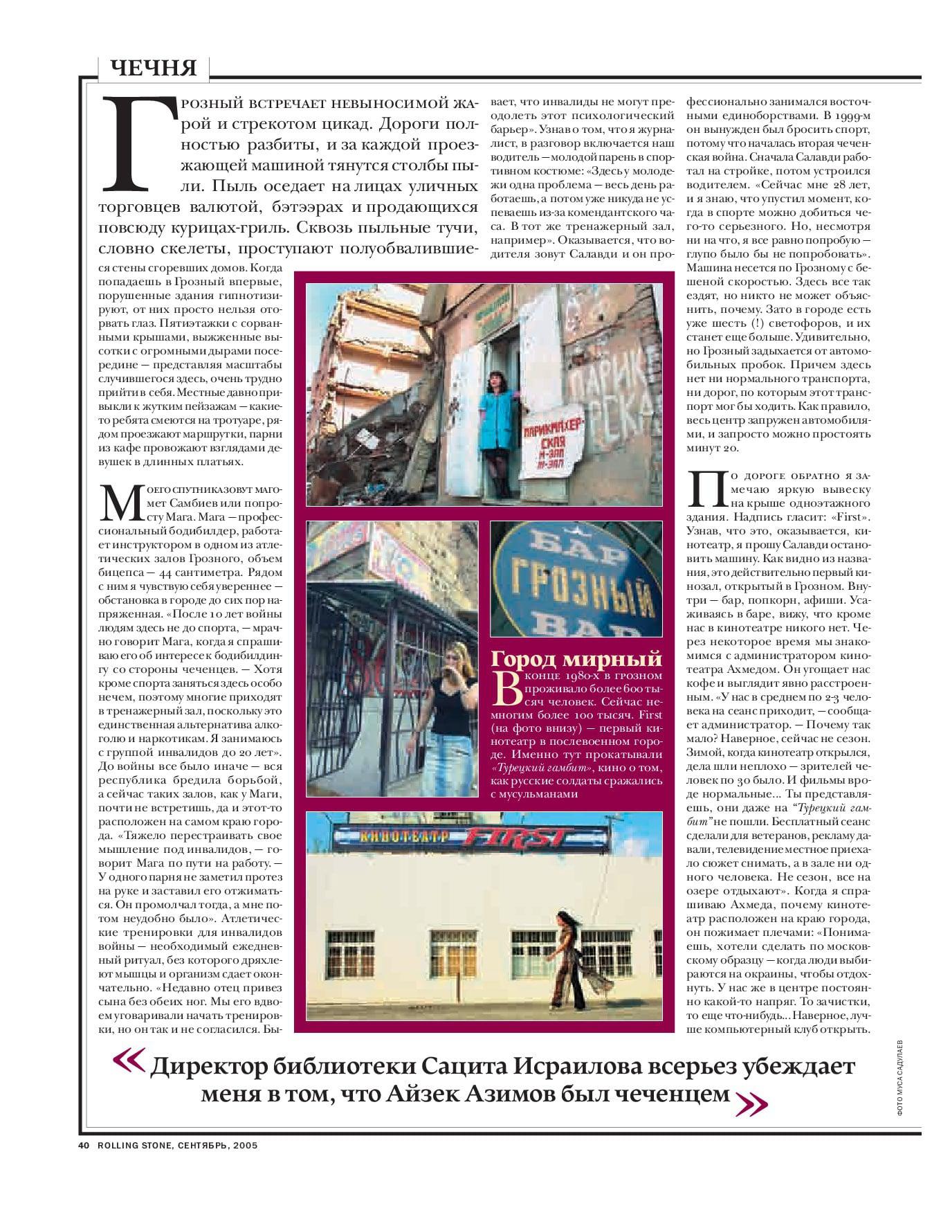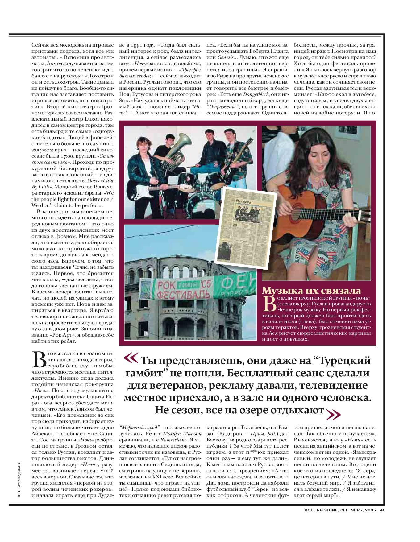 в 2005-м году в Грозном должны были провести масштабный всероссийский рок-фестиваль. я ухватился за эту идею, чтобы написать репортаж, но за пару дней до начала фестиваля объявили о его отмене по причинам безопасности. все-таки, Грозный в 2005 году был не самым спокойным городом. но я все же поехал, чтобы написать о том, какая есть в республике культурная жизнь. в итоге репортаж вышел в крутом журнальчике Rolling Stone и стал одним из первых по сути текстов из Грозного не на тему войны. предлагаю к прочтению. в сети его кстати нет, так что, в интернете публикуется впервые.