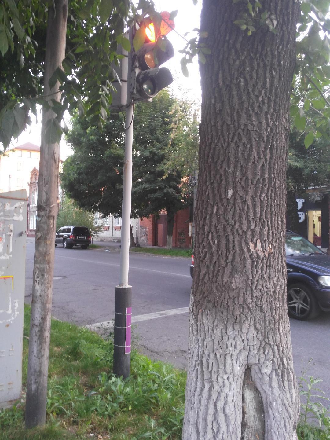 перехожу "зебру" и наконец обнаруживаю в листве едва заметные огни светофора.