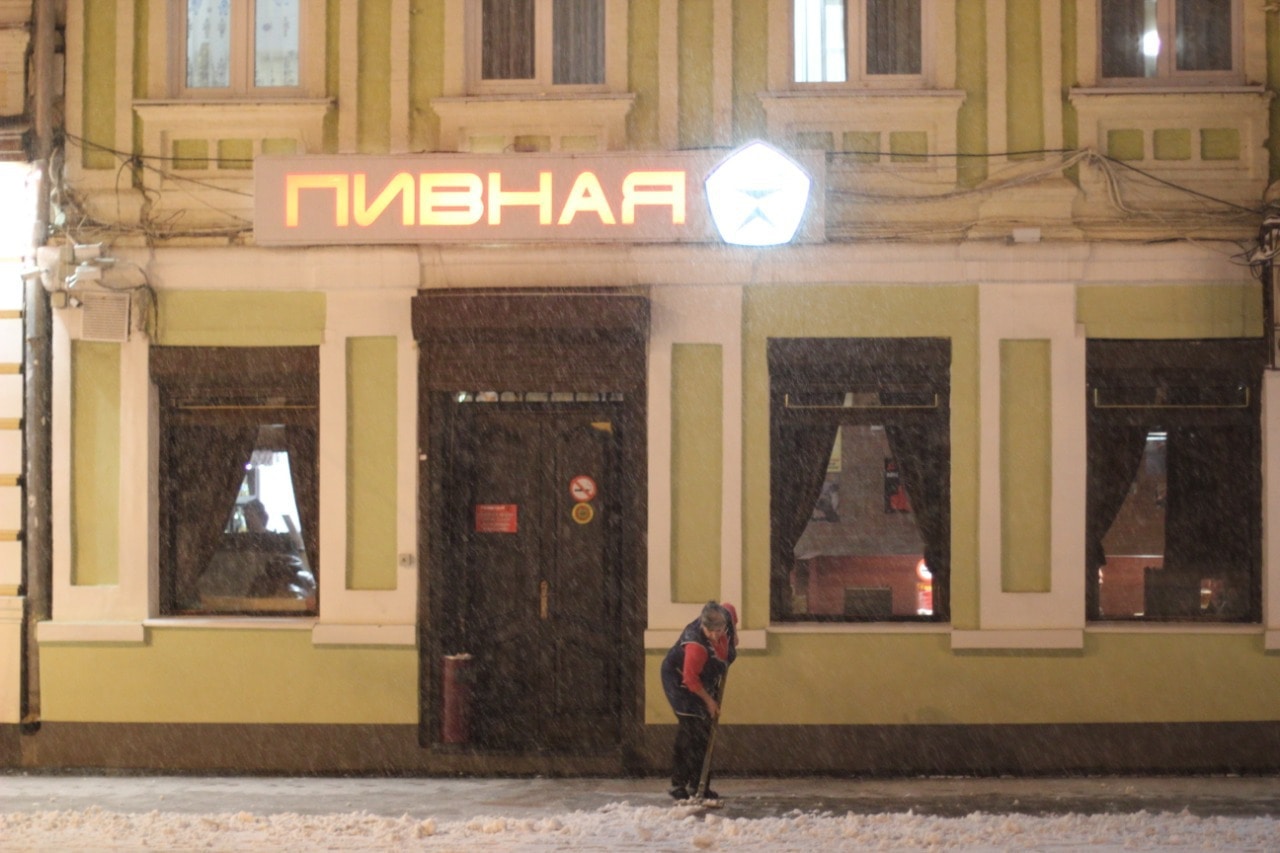 пивная "СССР" выглядит совсем по-советски с женщиной-уборщицей на улице: