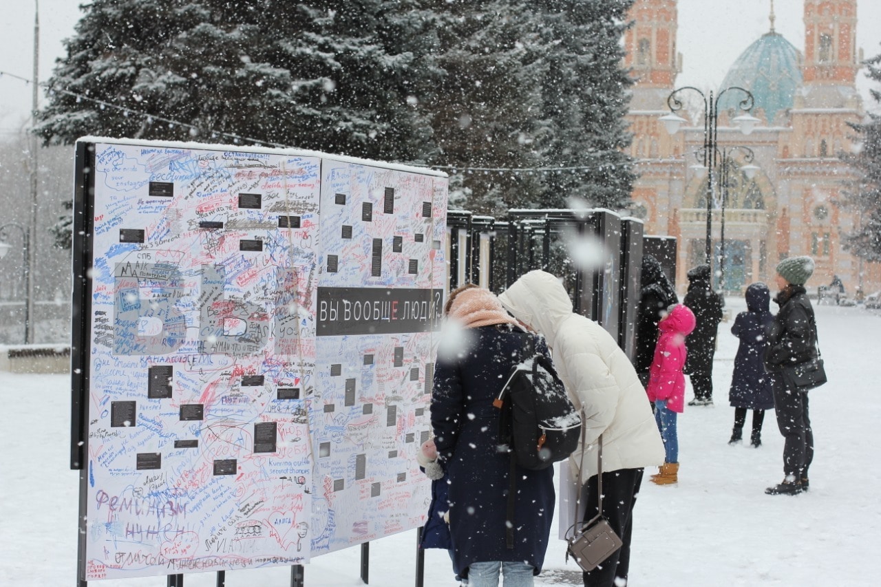 я попал на выставку лишь на третий день, что удивительно - несмотря на снегопад и мороз, людей было много, они подолгу стояли и читали эти длинные истории, проникали в истории героинь. это только говорит об актуальности проблемы.