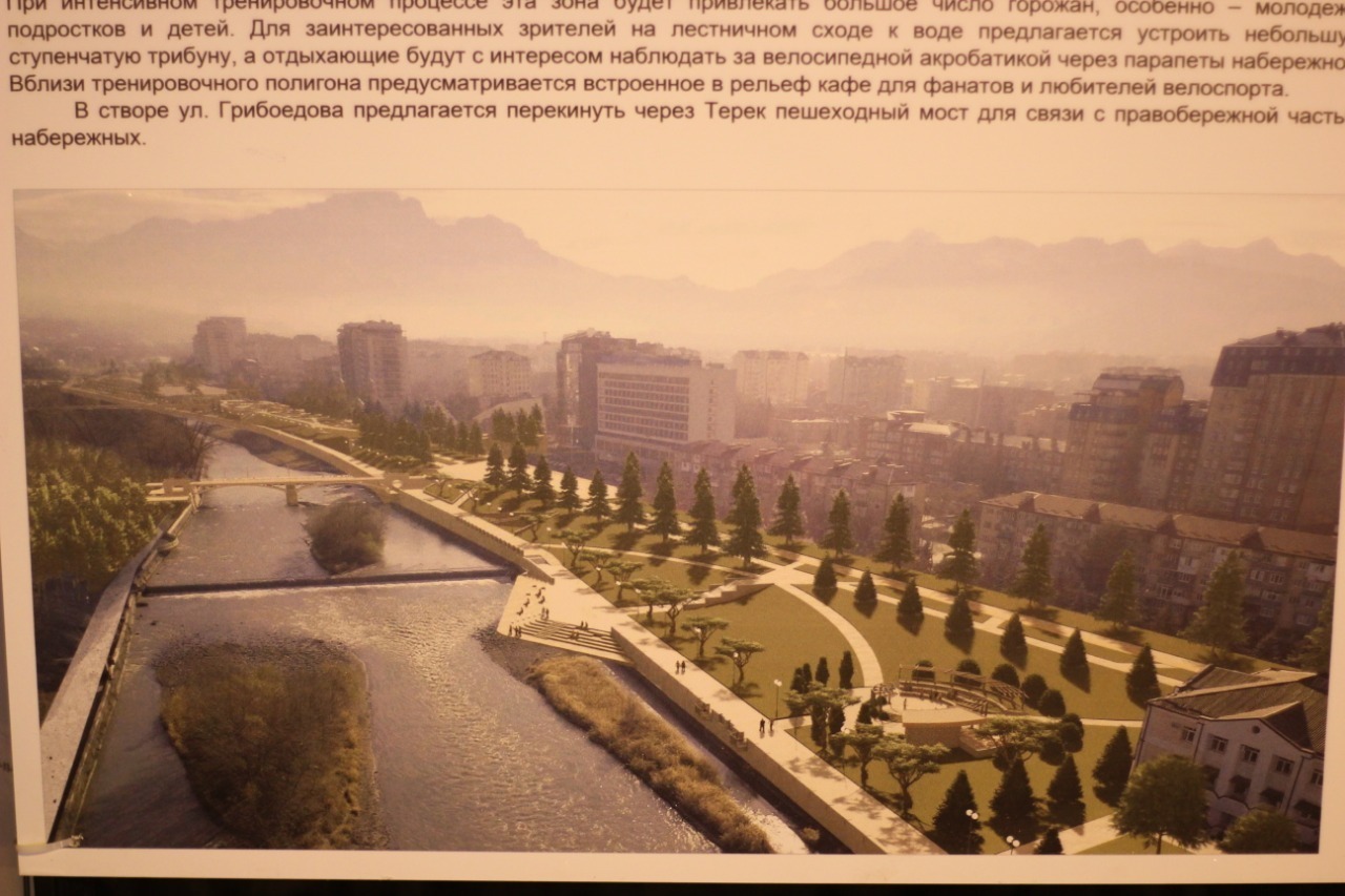 недавно появилась информация об очень масштабном проекте благоустройства всей центральной части набережной Владикавказа. с новыми тремя мостами через Терек (два пешеходных и один автомобильный), парковыми зонами, велодорожками и множеством еще всяких симпатичных деталей. основная концепция - гармония с природой. ну что ж, прекрасно. правда, не было фото. и вот появился баннер в центре города, где все это представлено, это и хочу показать. наверняка, жителям Владикавказа будет интересно как это себе представляют архитекторы. выглядит классно, современно, мне очень понравилось. например, очень здорово, что сделали специальные спуски к воде, причем оформили их в "диком" стиле, то есть, в естественном. пока, правда, ничего не говорится о сроках реализации. очень хочется верить, что это не останется на бумаге, как много чего из недавней истории Осетии.