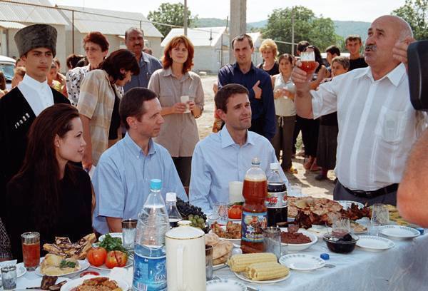 в августе 2003 года Анджелина Джоли провела встречу с беженцами из Южной Осетии в селе Комсомольское, Северная Осетия.