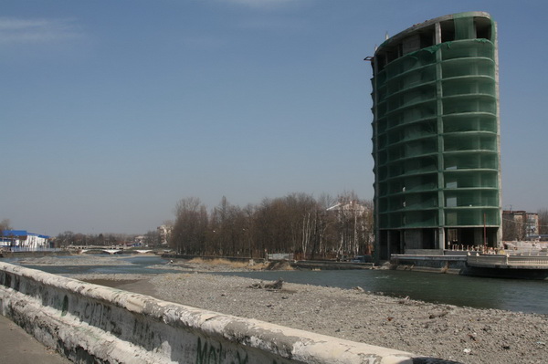 Это скандально здание в центре Владикавказа давно стало самым сканадльным и самым обсуждаемым из всех множественных случаев нарушений городской застройки. Нехорошо вспоминатm о человеке плохо, но как ни крути, а это наследие расстрелянного 31 декабря прошлого года мэра Владикавказа Казбека Пагиева. 12-этажное построенно вопреки всем возможным правилам, архитектурным, геологическим, культурным, логическим... Здание стоит на берегу Терека в самом центре города. В таком виде, что вы видете на фото, оно стоит уже больше года. Судебным решением был наложен запрет на его строительство. Да и градосовет проглосовал против. Но оно все равно выросло и зависло. Хотя, вокруг здания продолжаются работы, делают подходы к нему и прочее. Вот основные нарушения в постройке злоздания: