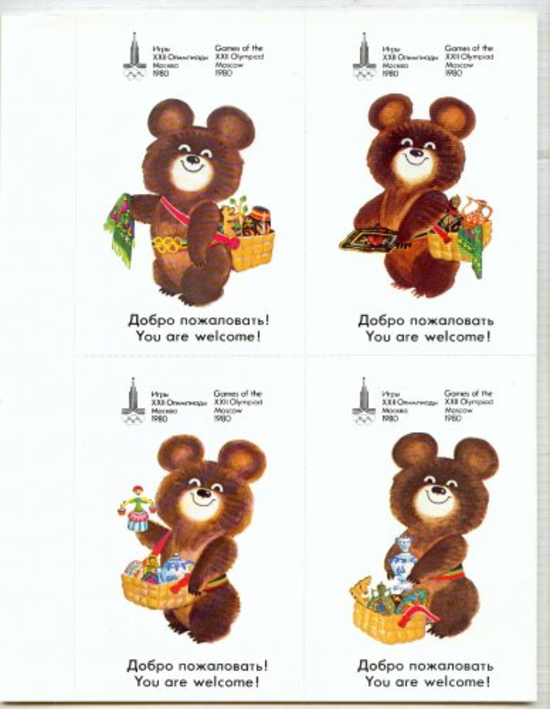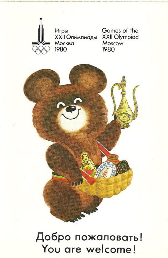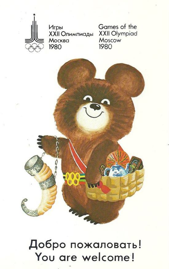 Образ медведя отсылал к теме русских народных сказок, символизировал и суровую природу, добродушие и силу, присущую фольколорному образу этого зверя.  Мишка, растиражированный на миллионах открыток, плакатов, брелков, футболок, был чрезвычайно популярен. Мишка с корзинками, полными подарков, букетами цветов, вместе с другими зверюшками полюбился и взрослым, и детям.
