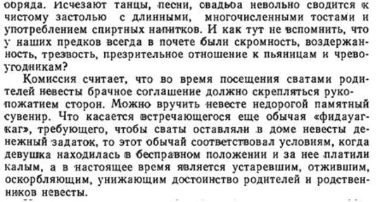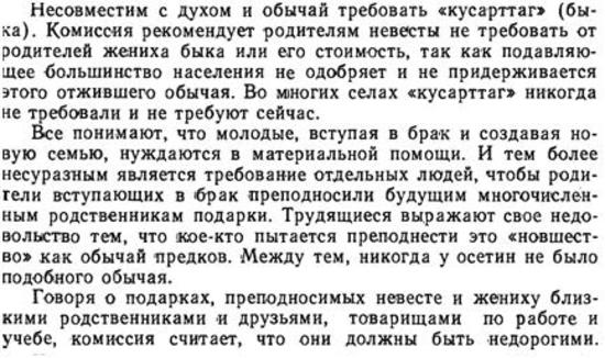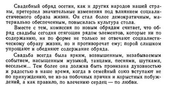 В 1985 году в Орджоникидзе (нынешнем Владикавказе) вышла брошюра «Примерные рекомендации по внедрению в быт трудящихся республики новых гражданских социалистических обрядов». Брошюра была издана в рамках антиалкогольной кампании, развернувшейся в стране при М. Горбачеве,  и начиналась с обращения «передовиков производства, общественных деятелей, представителей науки, литературы и искусства ко всем трудящимся Северной Осетии», всецело поддерживающих усилия партии и правительства «по решительному искоренению пьянства и алкоголизма». В обращении говорилось, что стали распространяться уродливые формы семейно-бытовых обрядов, в частности, свадебных. «Настало время, когда их уже нельзя терпеть,… многое нужно пересмотреть  в наших привычках», - с горечью говорили подписанты обращения.