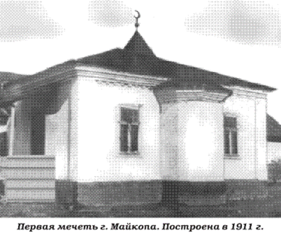 Немногие знают, что Соборная мечеть Майкопа, открытая в 1990-х гг., имела свою предшественницу – в самом центре дореволюционного Майкопа, рядом с нынешним Домом офицеров на улице Краснооктябрьской когда-то находился мусульманский храм.