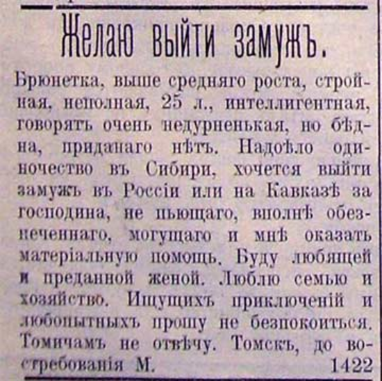 вполне соответствующую моим данным, т.-е. умницу, выше среднего роста, полную и здоровую, любящую литературу, чтобы играла на гитаре, и жизнерадостную, с добрым, веселым характером, чтобы могла любить и работать, любящую следить за хозяйством, чтобы со мной могла ездить на велосипеде, чтобы была художница-портретистка, чтобы любила фотографию, чтобы могла заработать в месяц 250 руб., чтобы любила одеваться по журналу, грациозную и симпатичную, умеющую ласково обращаться со всеми блондинку, шатенку или брюнетку, обеспеченную средствами, никогда не скучающую, лет 20 или 30. Национальность безразлична, вдова или барышня тоже. Желательна была бы невеста с собственным домом в столице или уездном городе. Ничего не имею против модистки или шляпницы, красивой блондинки, имеющей собственное заведенное дело, француженки или немки, русской и итальянки со знанием русского языка, одинокой. Содействие свахи приемлемо. Анонимам не отвечаю. Адресовать: Михайловская почта, Кубанской области, предъявителю книжки кассы за №10983. (БГ. 20 (07) июня 1909 г.)