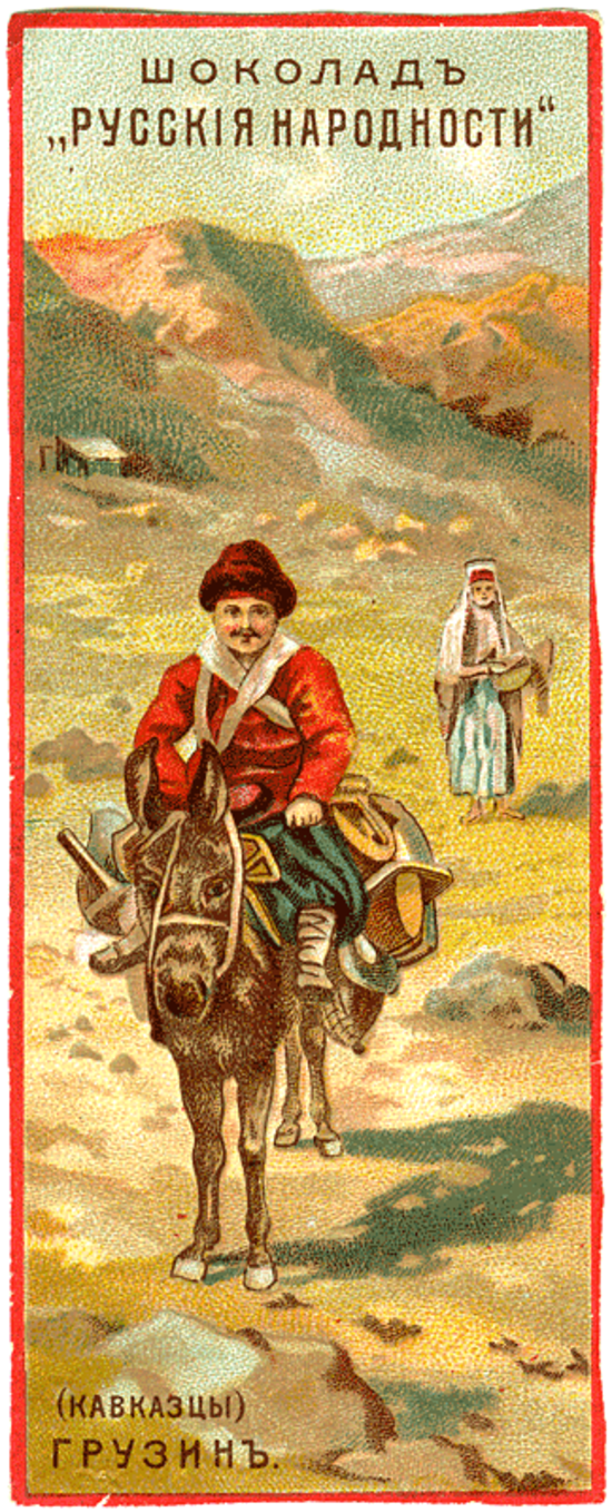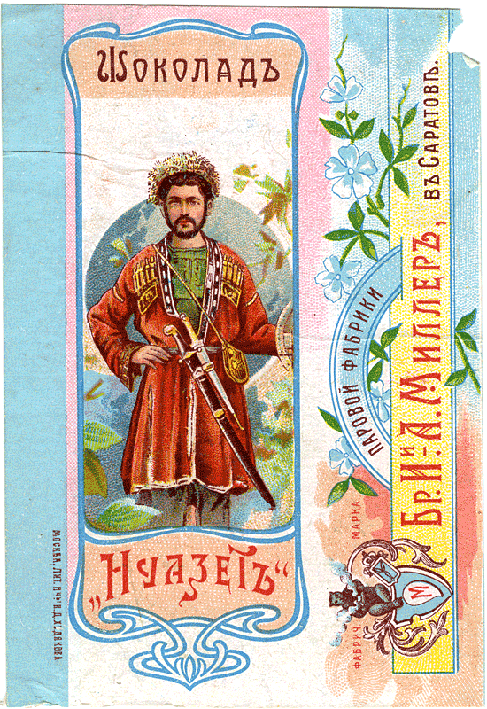 Тема Кавказа появляется на фантиках и обертках примерно в это же время. И реализуется не через изображение природы Кавказа, горы и буйные реки (что будет уже в советское время), а через изображения кавказских типажей. Например, фабрика братьев Миллер выпускает серию шоколада «Нуазет», в упаковке доминируют восточные мотивы, некий обобщенный образ Востока вообще. Отметим, что использование восточных мотивов как реакция на поражение в Крымской войне было характерно для рекламы, рекламных постеров во второй половине XIX века — слоны, изнеженные красавицы на атласных подушках, турки в фесках появлялись в это время в рекламе сигарет и мыла.